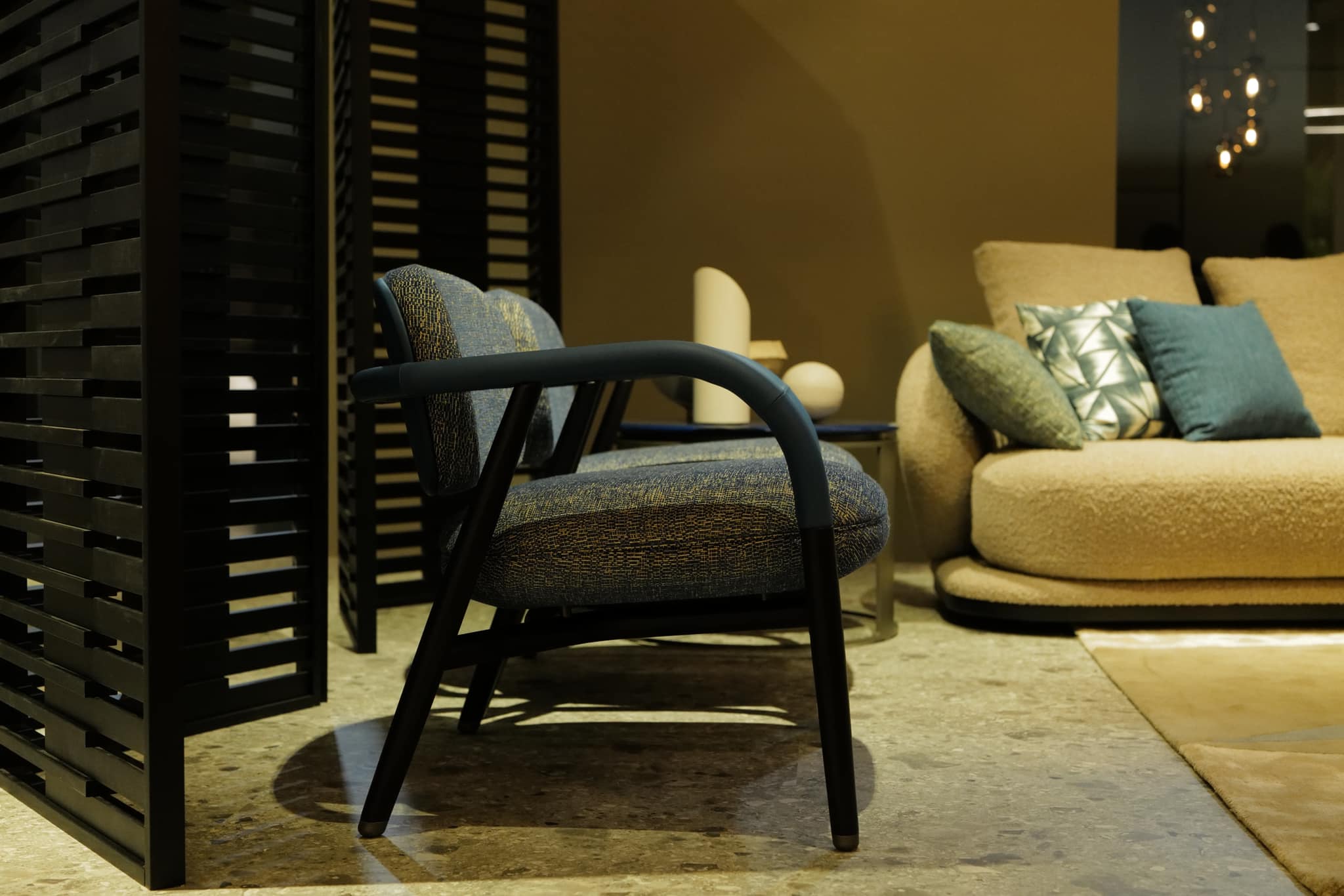 armchair upholstered with fabric and leather. Veneered wooden structure.